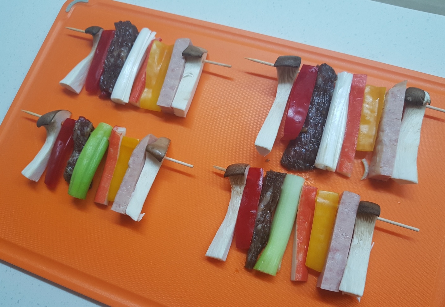 1. These are main ingredients for Korean skewers – beef, fish meat, mushroom, paprika, ham and flour. (If you want, you can add, subtract, or replace ingredients except flour)