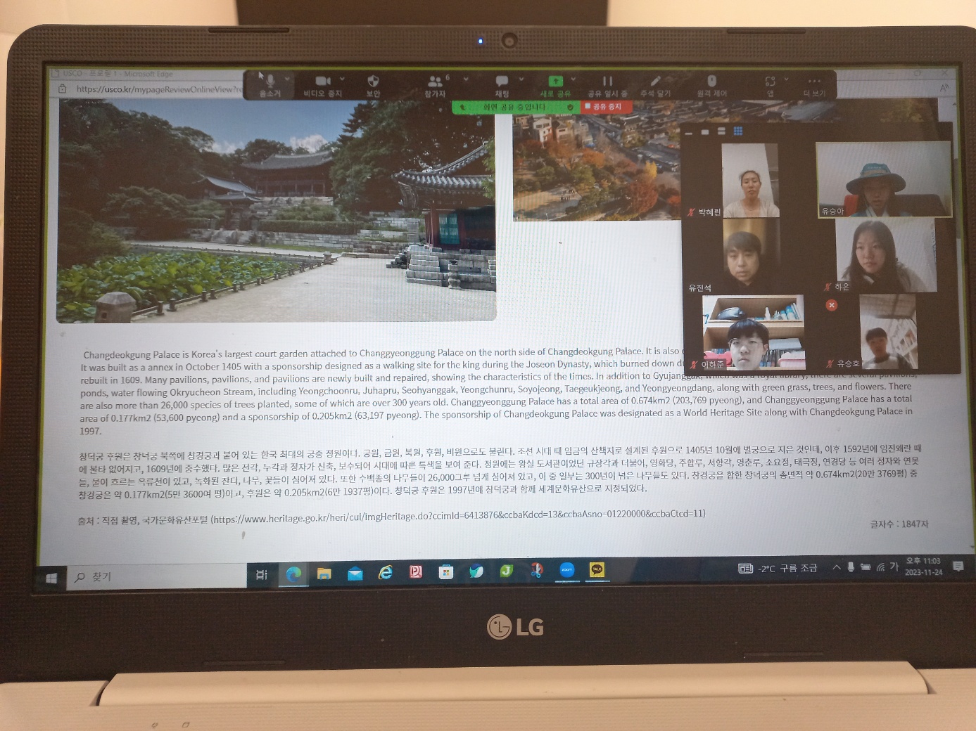 해설 제목: 아름다운 창덕궁 후원 해설대상: 아빠, 엄마, 동생, 사촌언니, 사촌친구 해설 인원: 5명 해설장소: zoom 해설소요시간: 30분 해설 내용: 예약하지 않으면 들어갈 수 없는 창덕궁 후원에 대하여 소개해주었습니다. 해설을 들은 사람들의 반응: 한번도 들어가본적 없는 곳에 대해서 소개를 받고 나서 한번 가보고 싶었다. 창덕궁 뒤에 이런 아름다운 곳이 있었다는 것을 알게 되었고 규장각이 있었다는 것도 알게 되었다. 해설사 자신의 느낀점, 개선할 점 등등: 창덕궁 후원에 직접 가보았을 때 신기하고 즐거웠던 경험을 이번 해설을 통해 전하고 나눌 수 있어서 좋았습니다. 또, 현장에 가서 설명을 한다면 더 재미있게 할 수 있을 것 같아서 해보고 싶습니다.